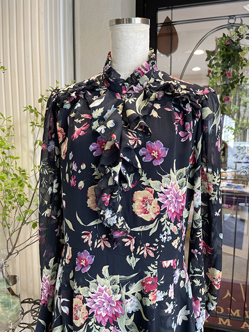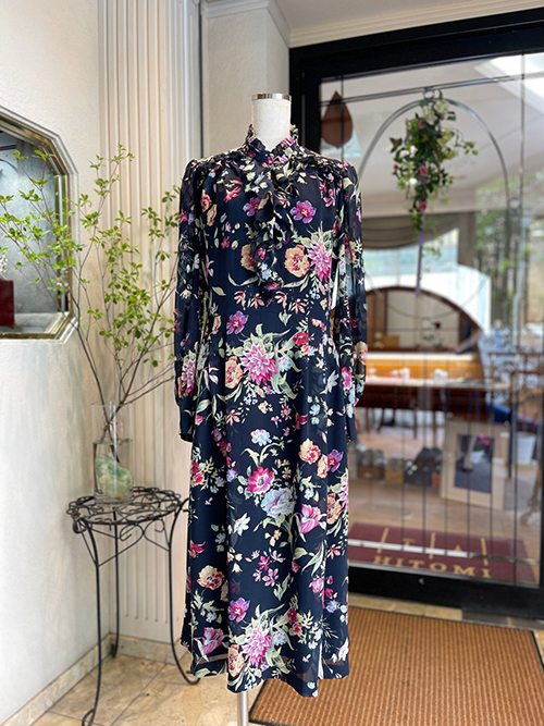 お客様からオーダーいただきましたシルクの発色が美しいワンピース🌹 衿元から前身頃にかけて繊細なフリルをあしらい、一枚で主役になる華やかな一着に仕上がりました👗 同素材で、スカーフとヘアリボンもお作りしました🪡🧵 1