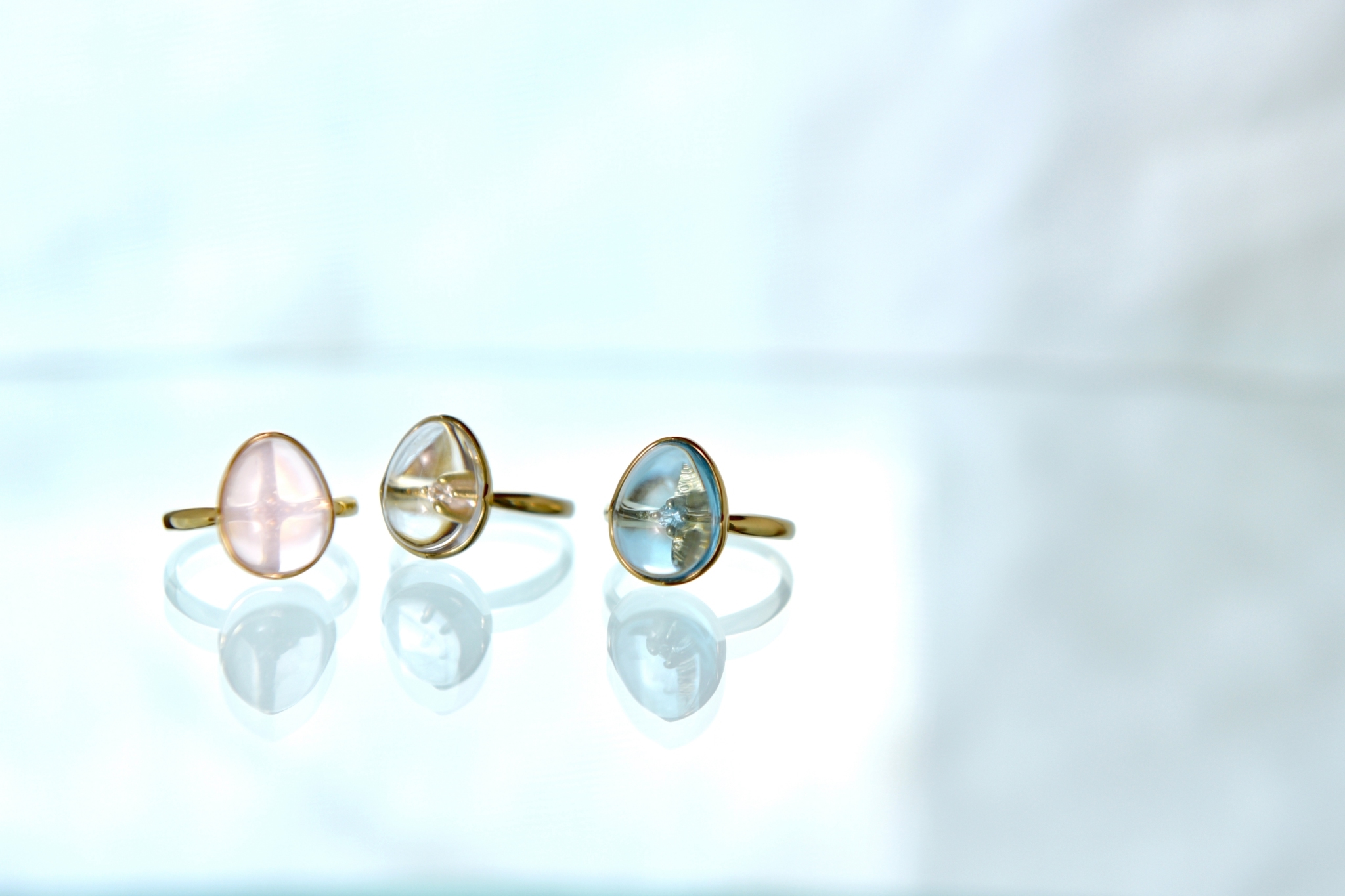 エッグオーバルのカタチをしたメインストーンの奥にはダイヤモンドが秘やかに、でも力強く輝いています。